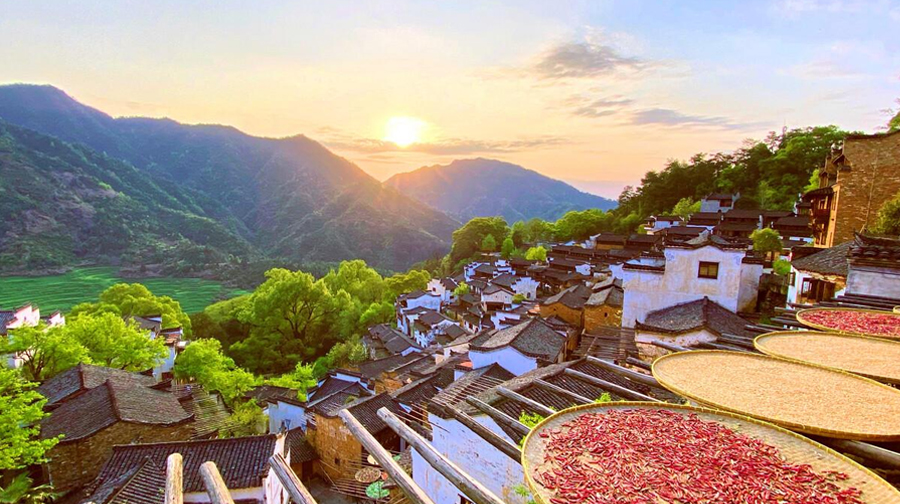篁嶺古村數(shù)百棟徽派民居在百米落差的坡面錯落排布,每當(dāng)日出山頭,晨曦映照,整個山間村落飽經(jīng)滄桑的徽式民居土磚外墻與曬架上、圓圓曬匾里五彩繽紛豐收果實組合,繪就出世界獨一無二的 “曬秋”農(nóng)俗景觀。